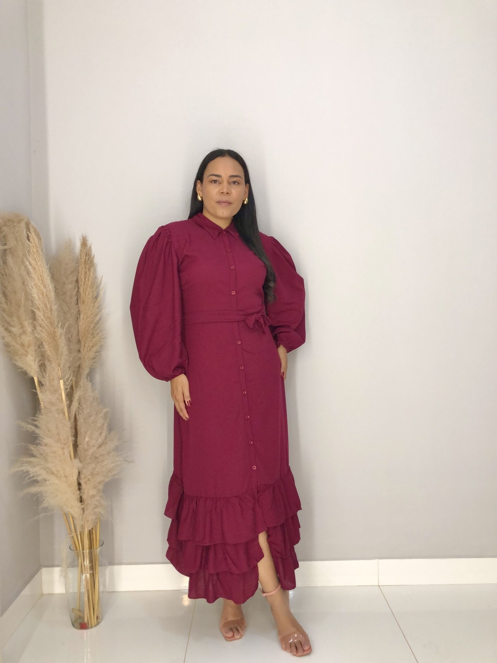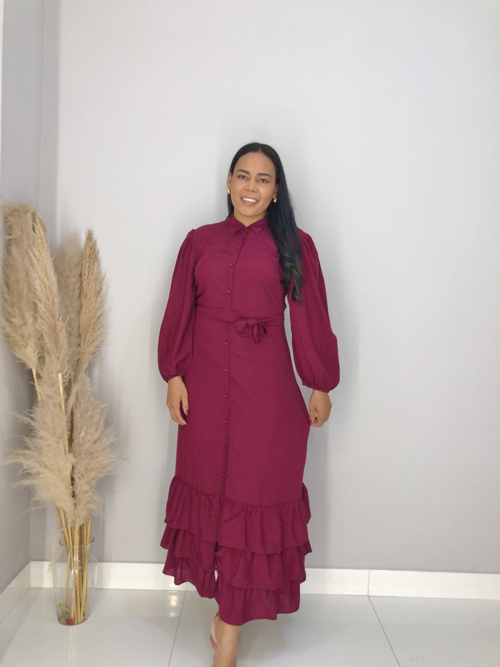 Vestido Vanessa no viscolinho,uma peça elegante e sofisticada ,sua leveza e atemporalidade o torna uma peça extremante necessária no seu guarda-roupa,é forrado (forro embutido no próprio tecido do vestido deixando assim a peça mais confortável, sem bojo ,mangas levementes princesa,botoês ate o pescoço podendo usá-lo tanto aberto como fechado,babados na barra deixando a peça mais romântica.
